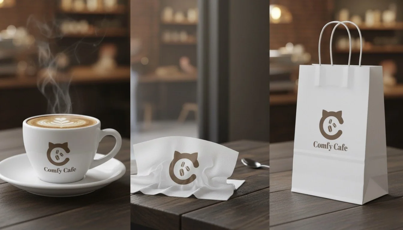 A cohesive brand identity that communicates warmth, friendliness, and the café’s cat-friendly atmosphere, applied across all packaging and signage mockups.